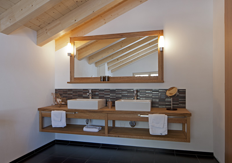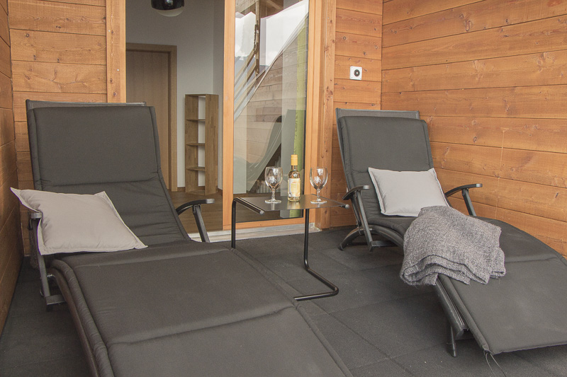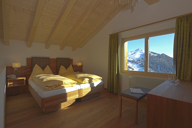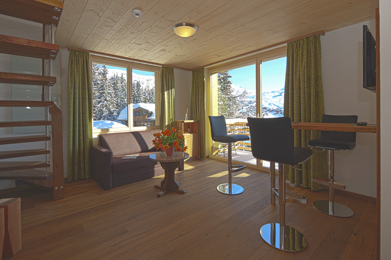 Dachsuite „Top of Waldhaus“ (60m2) auf 2 Etagen: unten kleiner Wohnraum mit Minibar, TV, Garderobe, Tagestoilette und Balkon ost,